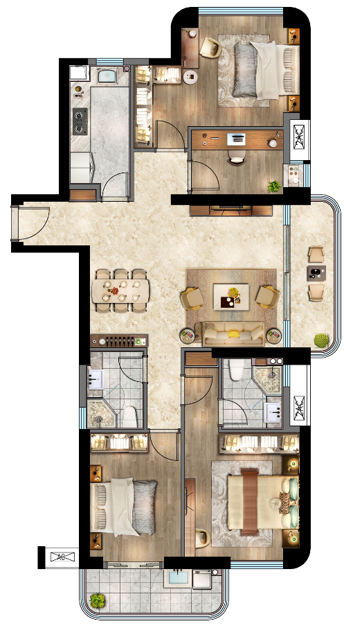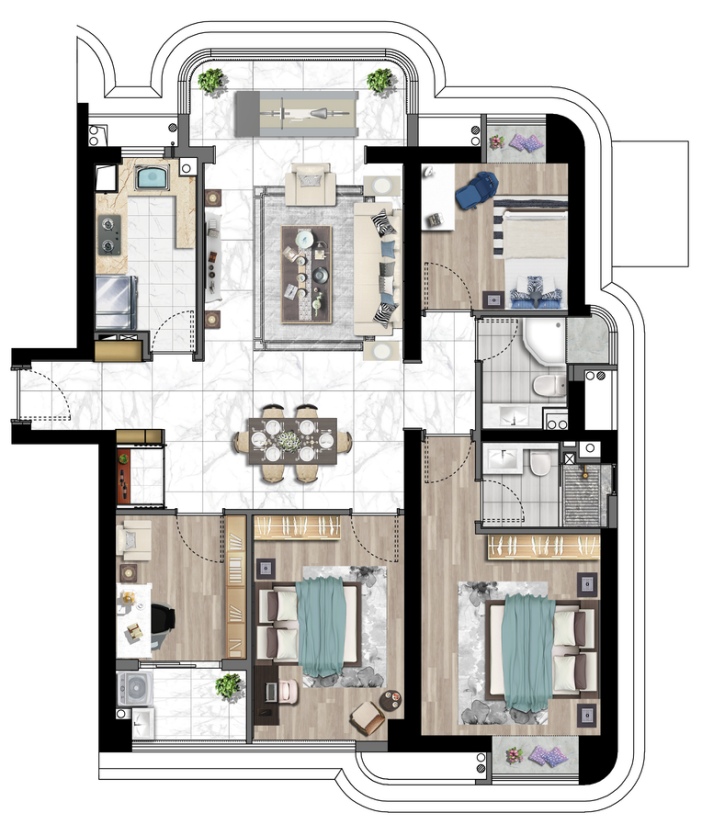 B户型 建筑面积约:139.1-141.7㎡ 雍容:阔绰双厅,方正户型,大宅气度不彰自显 盛境:三大观景阳台,引阳光美景入室,旖旎风光犒赏生活 书香:独立书房,翰墨书香蕰诗意,静享闲适时光 尊崇:南向奢阔主卧,独立卫浴,尽显尊崇气度